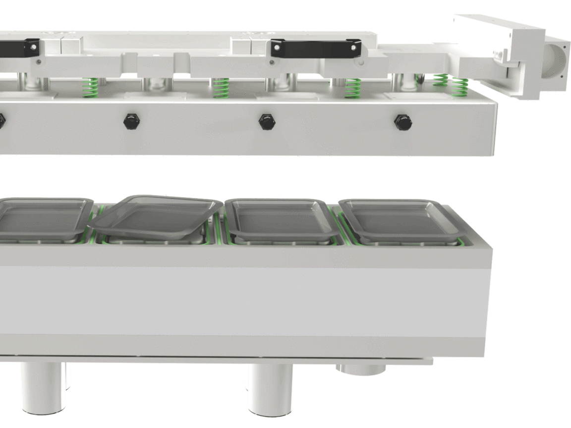 FOODPACK Hyper Tray Sealer is a new concept in-line Tray Sealer resulting in 60+ years of professional engineering experience and continuous research and development. All the main movements are mechanical and driven by servo motors. With the Hyper models technology and engineers, customers can expect the highest level of production throughput with minimal film scrap waste, thanks to the newly engineered tooling. The movement of the containers towards the area of sealing takes place through high precision, continuous motion technology. This process takes place by a set of transport jaws working in complete synergy with the infeed belt and picking up the containers and transporting them inside the area of sealing, without deceleration of speed. In the station of sealing servo technology guarantees precision, speed of execution, reduced maintenance and no compressed air consumption. The film tensioning is automatic and electronically controlled, and mould changeover has been made easier than ever before.