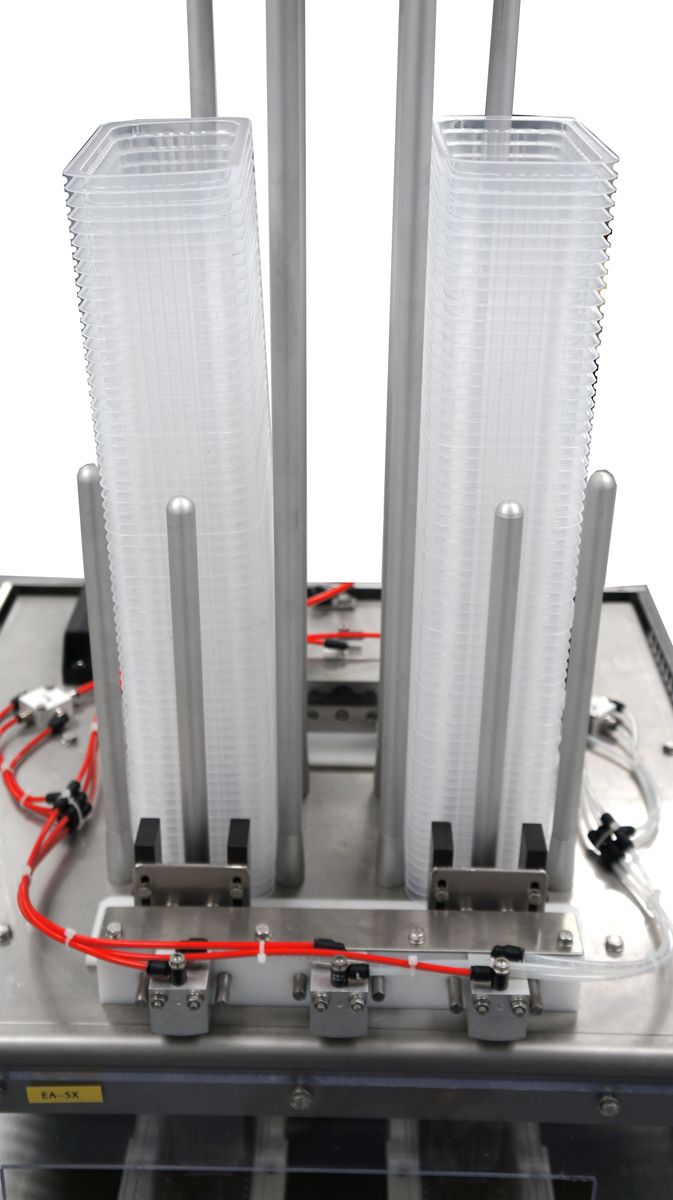 This is a pneumatically operated system which operates with suction cups to pull the trays down from their storage, which is the pushed forward onto the line by one or two pushers.